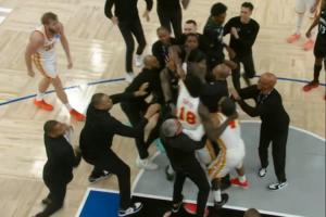 森林狼老鹰比赛第三节,盖耶卡位中推拉里德引里德不满,两人贴面输出,随后发展成拉拽冲突!双方多名球员和助教前来拉架。